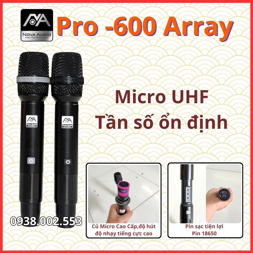 Micro Nova 600V Array đời mới nhất 2026 công nghệ UHF tần sóng ổn định và kết nối tốt ở khoảng cách xa. Ngoài ra có nút SET tần số để có thể chọn những tần số ổn định khi xung quanh có nhiều loa và micro gây ảnh hưởng. Nút Tăng/Giảm âm lượng có thể tùy chỉnh.