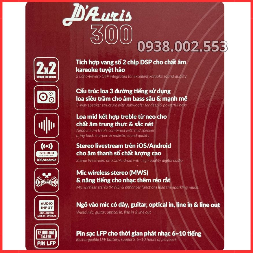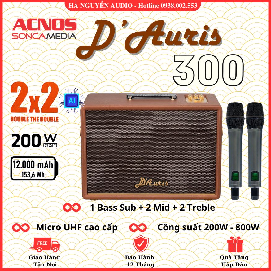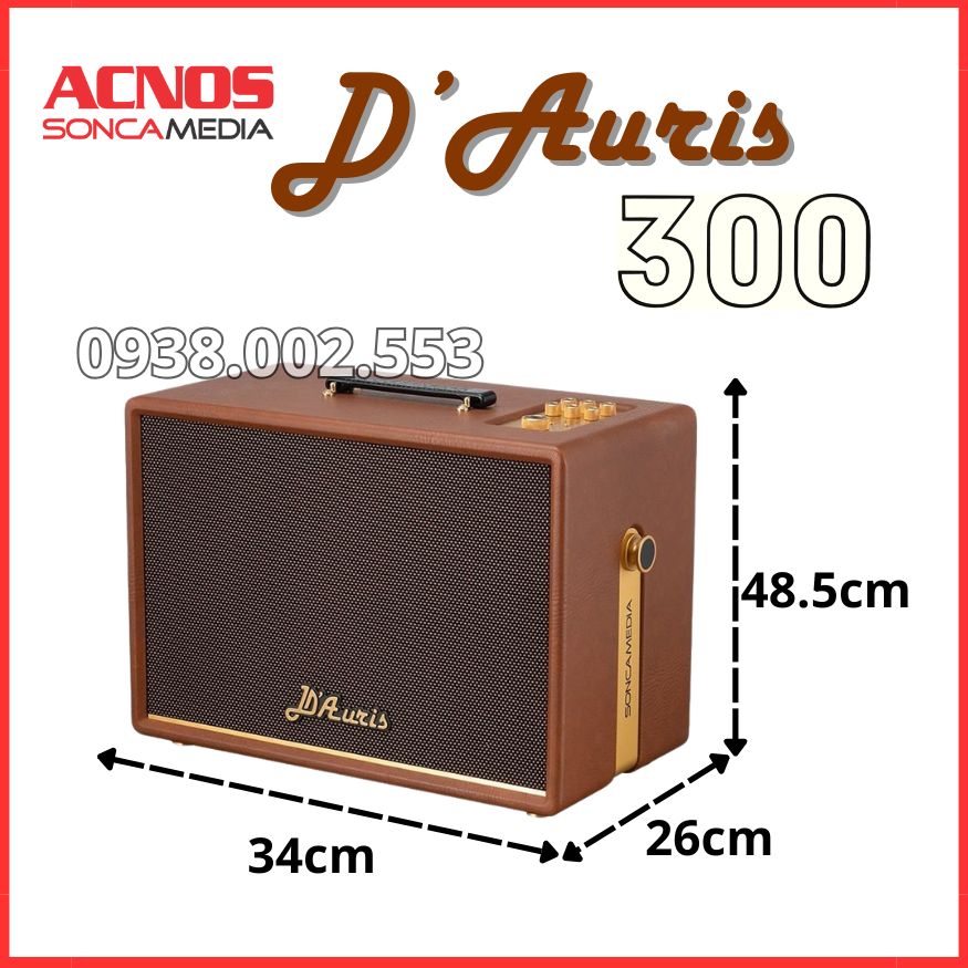 Acnos D'Auris 300 không chỉ là một chiếc loa, đó là một tác phẩm nghệ thuật âm thanh. Được định vị trong phân khúc cao cấp của nhà SoncaMedia (Acnos), D'Auris 300 hứa hẹn mang đến trải nghiệm giải trí chuẩn "Phòng hát hạng sang" ngay tại gia đình hoặc trong những chuyến dã ngoại.