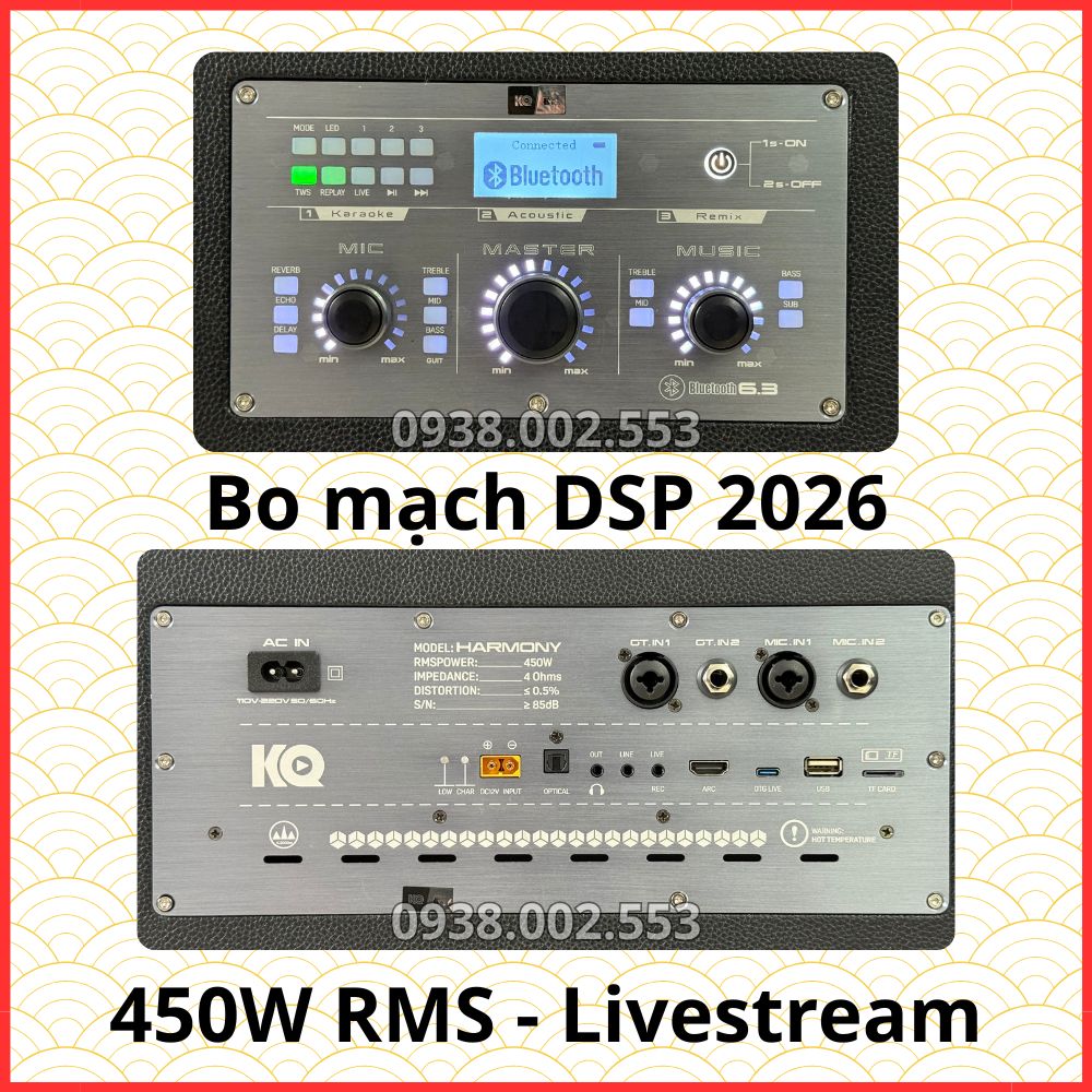Bo Mạch công suất 450W RMS - 3 Loa treble - 3 loa Mid - 1 Loa Sub hứa hên sẽ đem đến trải nghiệm mới lạ cho khách hàng đam mê dòng loa Loa Karaoke Xách Tay 𝐊𝐐 𝐇𝐚𝐫𝐦𝐨𝐧𝐲 của thương hiệu KCBox