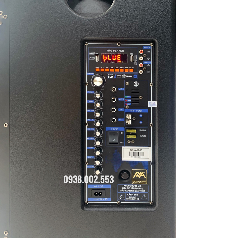 - Loa Kéo Nova Audio B30 trong năm 2023 cung cấp nhiều tùy chọn kết nối, bao gồm USB, thẻ nhớ, Bluetooth và AUX/Line, cho phép bạn dễ dàng phát nhạc từ các nguồn khác nhau. Nó cũng có 2 cổng ngõ cắm micro có dây và 2 cổng ngõ cắm nhạc cụ, cho phép bạn kết nối và sử dụng nhiều thiết bị âm thanh.
