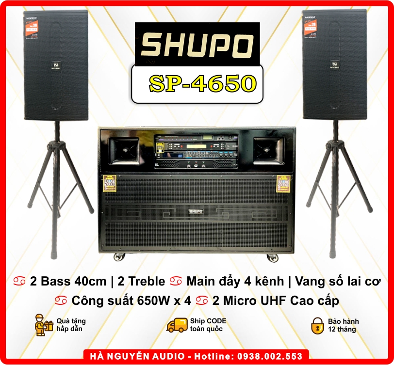 Loa kéo tủ điện ngang 4 kênh SP-4650 Cấu hình khủng với 2 Bass Nhập (Từ 190 coil 75 | 2 Treble 450 Neo Bi là mẫu loa kéo được thiết kế với kiểu dáng mạnh mẽ đi kèm với công suất cực khủng (400-1000W) cùng chất lượng âm thanh đạt chuẩn tốt nhất đây chắc chắn SP 4650 sẽ là mẫu loa karaoke mà bạn không thể nào bỏ qua.