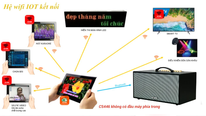 Một điểm riêng biệt của Acnos CS446 so với các mẫu loa kéo khác đó là nút tăng bass Boost Bass dành riêng cho nhạc sàn sôi động. Ngoài ra loa kéo di động Acnos CS446 còn được trang bị ứng dụng hát karaoke online và offline qua app Cloud Karaoke với hàng chục nghìn bài hát chất lượng cao mang lại trải nghiệm như phòng karaoke chuyên nghiệp. Tích hợp công nghệ bluetooth 5.0 loa kéo chính hãng Acnos CS446 có khả năng kết nối cùng lúc 8 thiết bị di động thông minh khác nhau.
