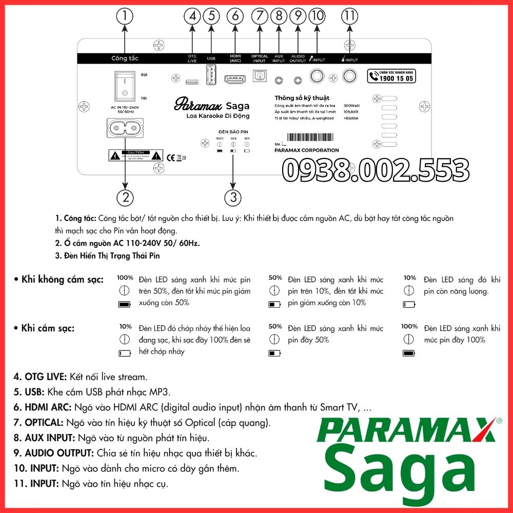 Loa Karaoke Di Động Paramax SAGA được trang bị chip DSP 32 bit mới nhất, Xử lý âm thanh chính xác và đầy đủ toàn bộ dải tần.